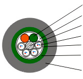 GYTS(A)型—中心金屬加強構件,松套管 (PBT)填充油膏,層絞并填充防水復合物,外纏包帶,鋼帶(鋁帶)一聚乙烯粘結護套。
