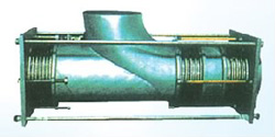 該膨脹節的前部(輸流端)有二個工作波紋管,后部(盲端)有一個平衡波紋管構成,工作波紋管吸收來自彎管段產生的橫向位移;平衡波紋管吸收來自直管段的軸向位移。當彎管段產生橫向位移時拉桿上球面螺母繞球面墊圈轉動,同時拉桿承受內壓的推力。因此該膨脹節常用于泵、罐、壓縮機、汽輪機出口處,以減少對上述設備的作用力。
